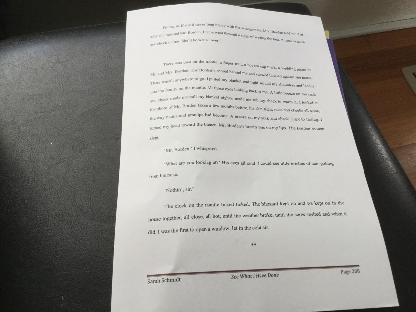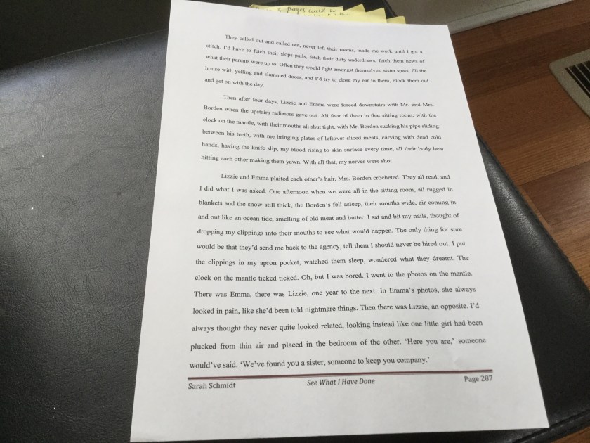 Could I have kept going, kept revising and reimagining? I’m sure I could’ve. I’m sure some readers out there will think I shouldv’e scrapped the whole thing. Maybe maybe not. But this is what the book is. I’m taking what I learnt about See What I Have Done and using that knowledge for my second novel, discovering what type of writer I’ve become, where I might go next.