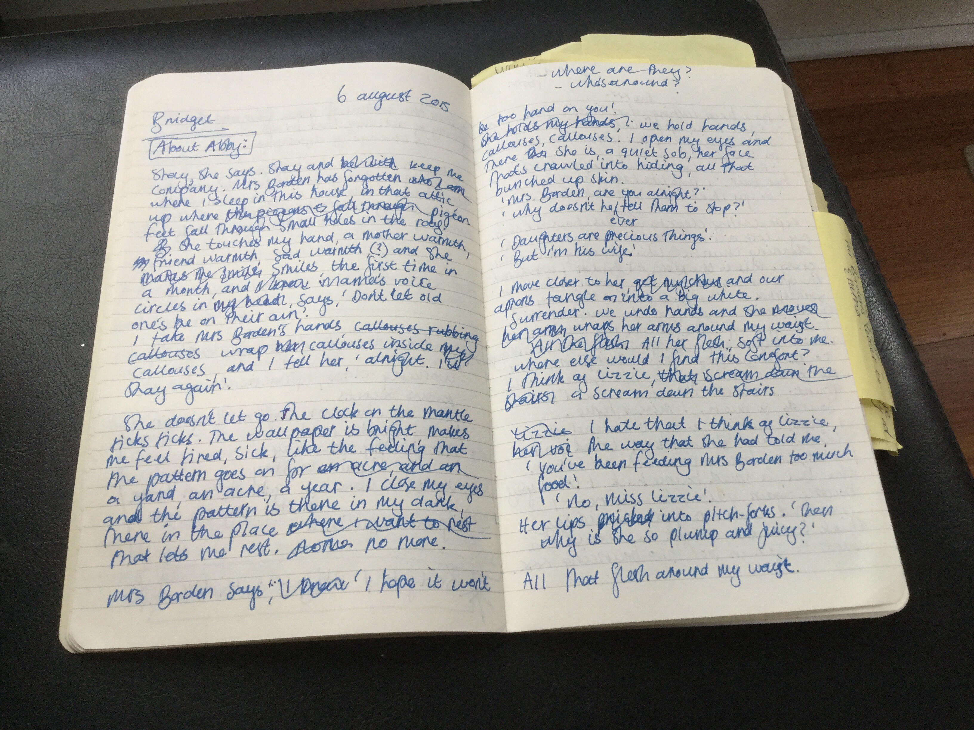I was terrified and overwhelmed when I began writing Bridget as a narrator into the novel (she was once a peripheral character. Now she’s probably my favourite part of the book). Want to see me at my most vulnerable on the page? Here are some Bridget excerpts from various stages of drafting, right to the finished page. Much of what I wrote never made it into the manuscript that was submitted to publishers, let alone the final version of the book. But writing passage after passage of false starts helped me shape the character and allowed me to strategise how I would use Bridget in the book.