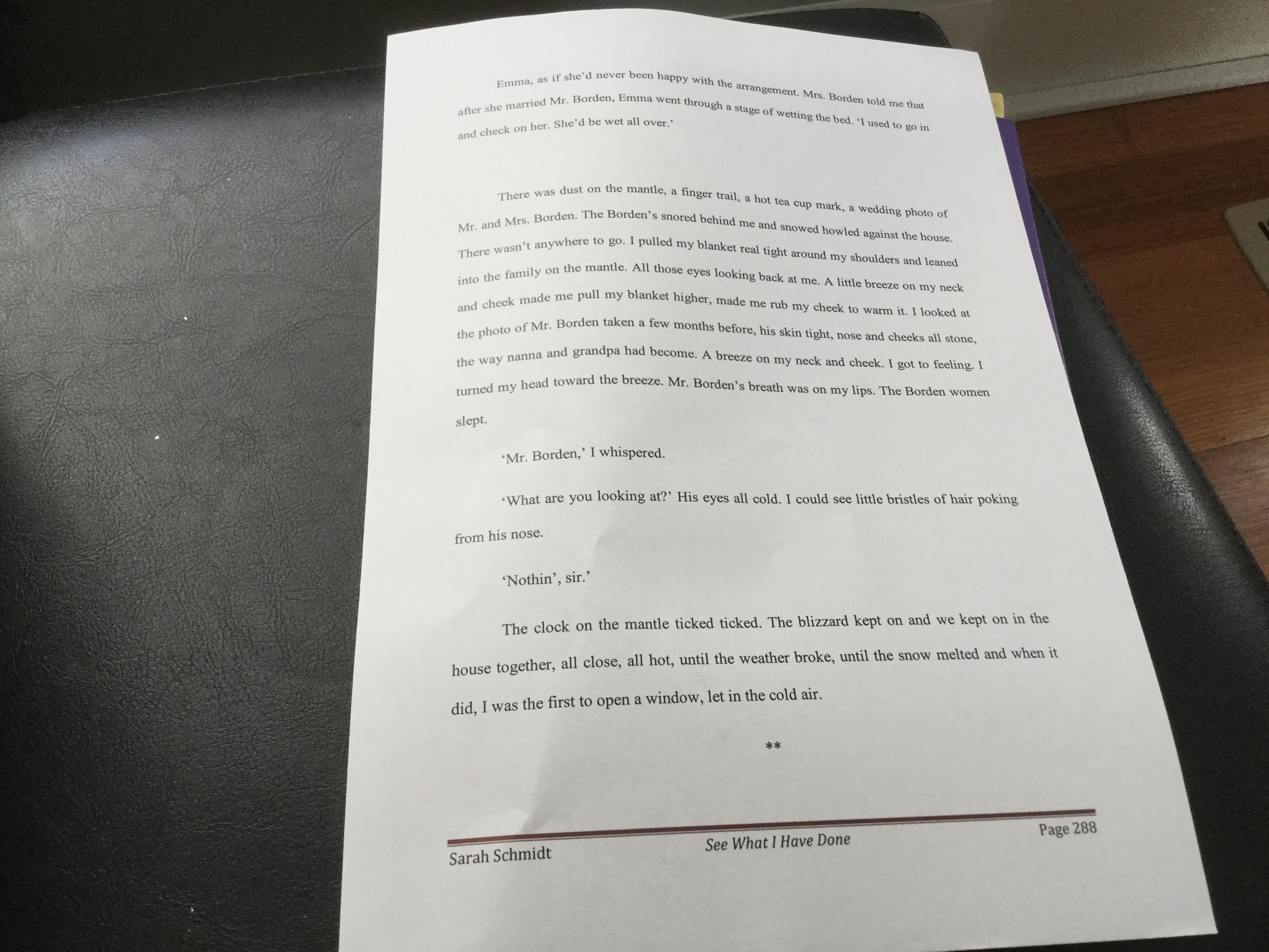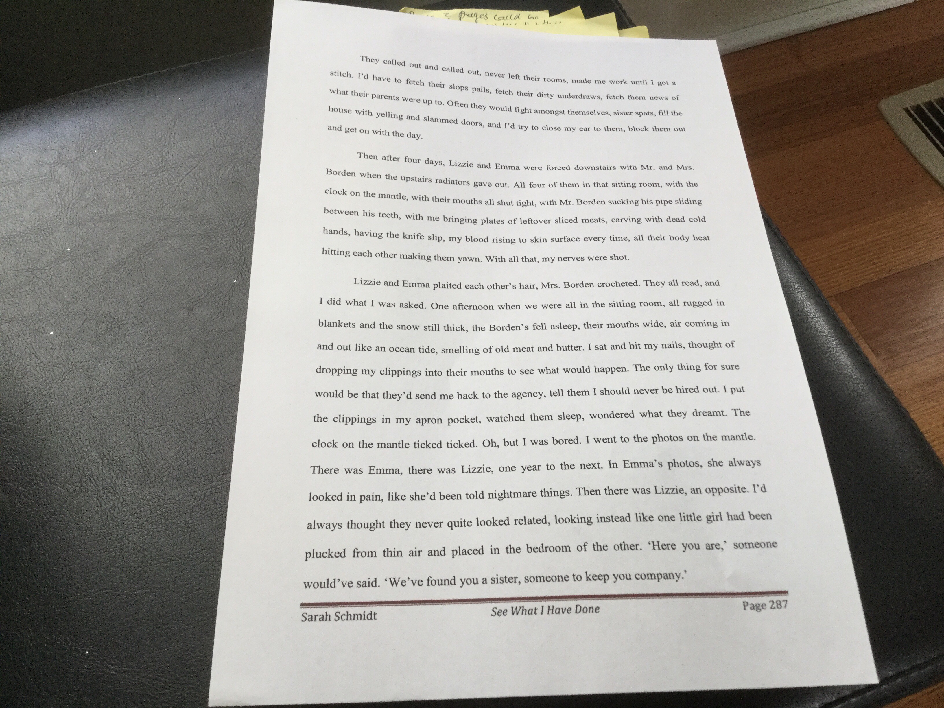 I have lost count of the drafts I wrote for See What I Have Done. Over the eleven years it took me to write the book I know there would have been at least twelve drafts (more. I know there was more). Some drafts changed dramatically, while others very little, perhaps only a narrator’s storyline was drafted, perhaps the draft concentrated in building the mood of the manuscript. In hindsight I know I wrote this book in the worst possible way. But living, learning.
