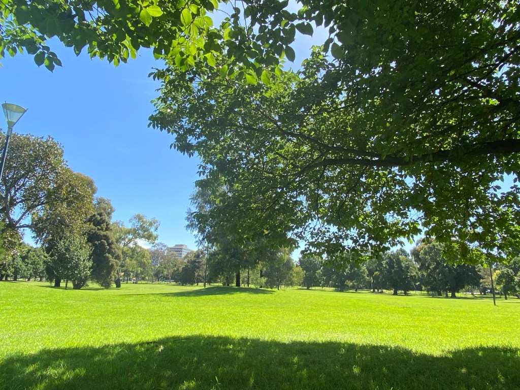 Here: smell of over ripe green grass, of rain that dried up days and days before. Thirsty dirt holding tight to green and white blades, to the tornado of tiny black insects lunging a meter into the air as a dog sprints toward me: that dry-swear fur, of dogs in the back of hot cars, windows down. This the scent of a Friday afternoon in January in Princes Park.